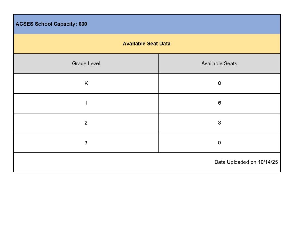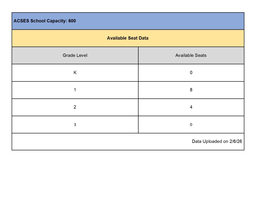 Below is our student capacity/seat availability, by grade level. We are required to update this information every 12 weeks, please note that the capacity number may change during the 12-week period as family members may withdraw or new families apply.